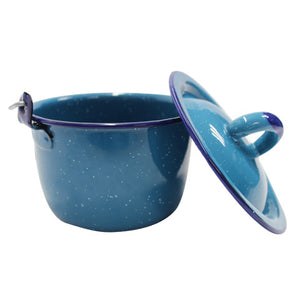 Olla de peltre en color azul con agarradera. Capacidad de 1 litro.
